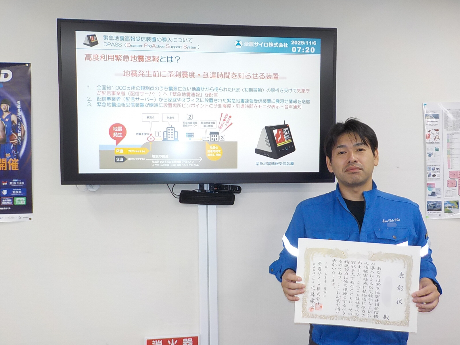 2025年11月、「緊急地震速報受信機の導入による防災強化ならびに人的損害軽減」を提案・導入したことから、 当社の表彰規定に基づき鹿島支店社員が表彰されました。 この受信機は「地震発生前」に予測震度・到達時間を知らせるものであり、地震への心構えができます。 震度5以上であれば自動構内放送による現場周知を行い、震度6以上であれば当社の搬入・搬出設備を自動で緊急停止します。 なお、津波警報にも対応しており、2025年7月の津波警報発令時は避難指示の構内放送が発報されました。