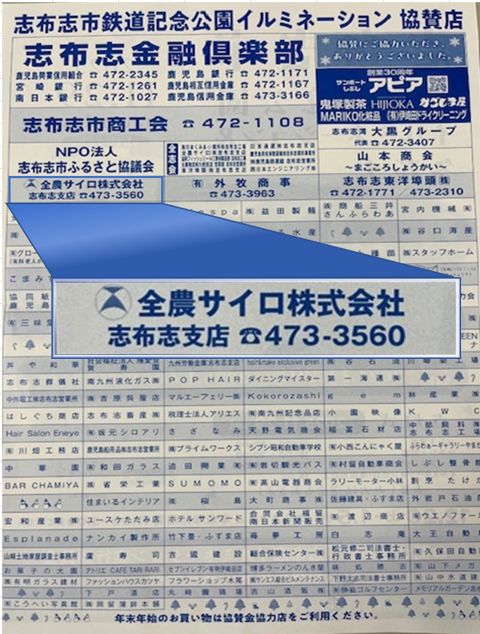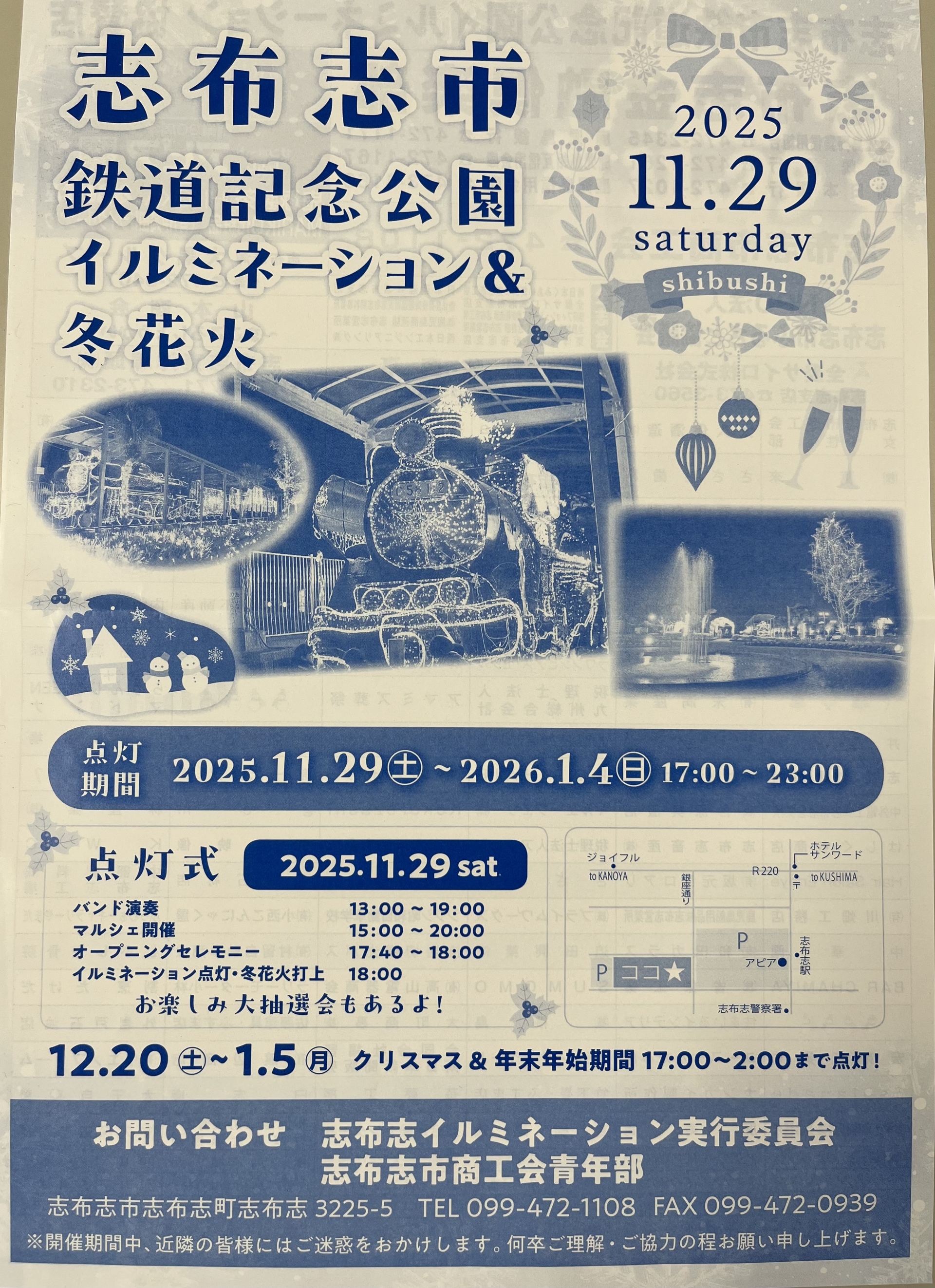 2025年11月29日(土)、志布志市鉄道記念公園にて、協賛したイルミネーション&冬花火のイベントがありました。 シンボルツリーやSL等がイルミネーションで彩られて、点灯式の後には冬の夜空に花火が打ち上げられました。 小さい子供連れのご家族や若いカップルの姿も多く、たくさんの人が集まり写真撮影を楽しんでいました。